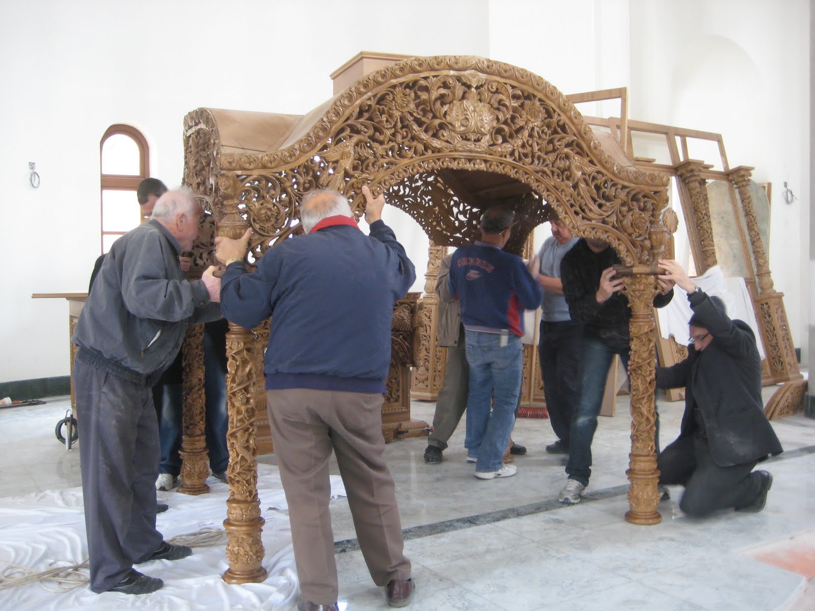 Today the wood-carver Mr. Eugenios Amanatides with his associate Costas came from Thessaloniki, Macedonia, North Greece in order to help us put all the wood-carvings in place.